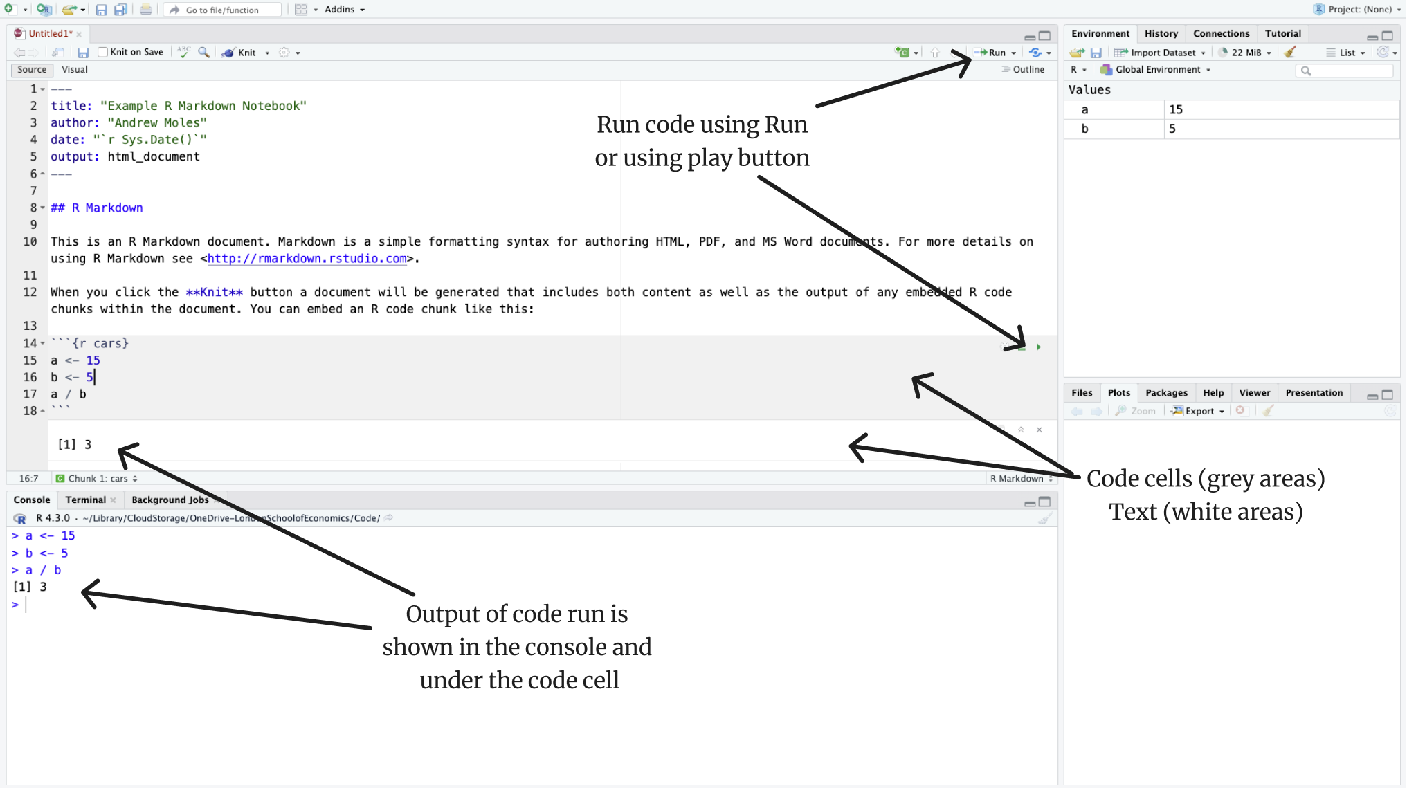 The most important thing for you to take note of is the code cells. Each code cell is like a small R script. Youโll notice the ``` markings around the code cell. It is important these do not get deleted, so be careful when editing your code!