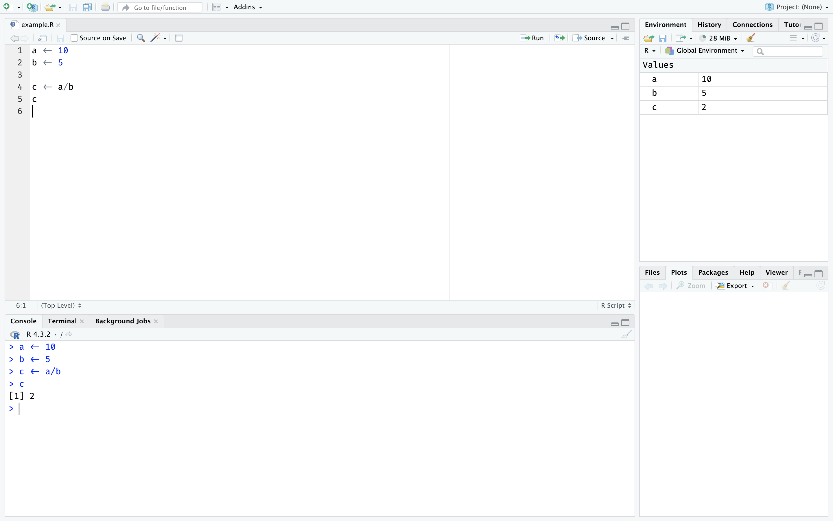 is the console. On the bottom right there is the files/plot panel, and top right is the environment panel.
