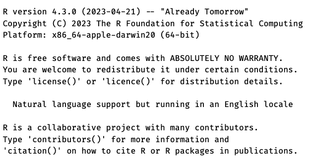 If your installation of R and RStudio has worked, first RStudio should be open, and second you should see a message in your console panel telling you the version of R you have installed, like the image below.
