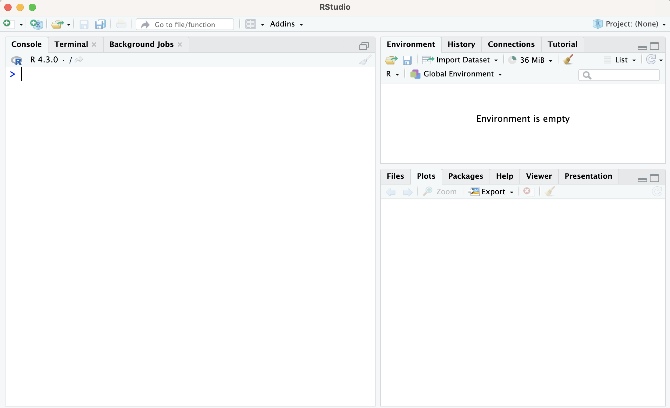 When RStudio opens you should see a layout with 3 panels, similar to the image below.